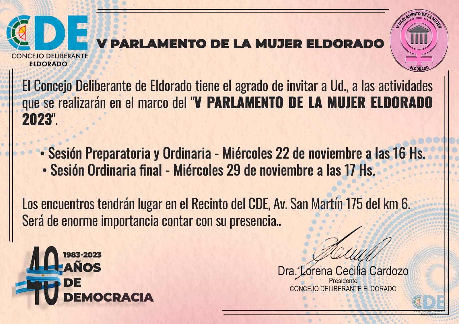 El Concejo Deliberante de Eldorado tiene el agrado de invitar a Ud., a las actividades que se realizarán en el marco del “V PARLAMENTO DE